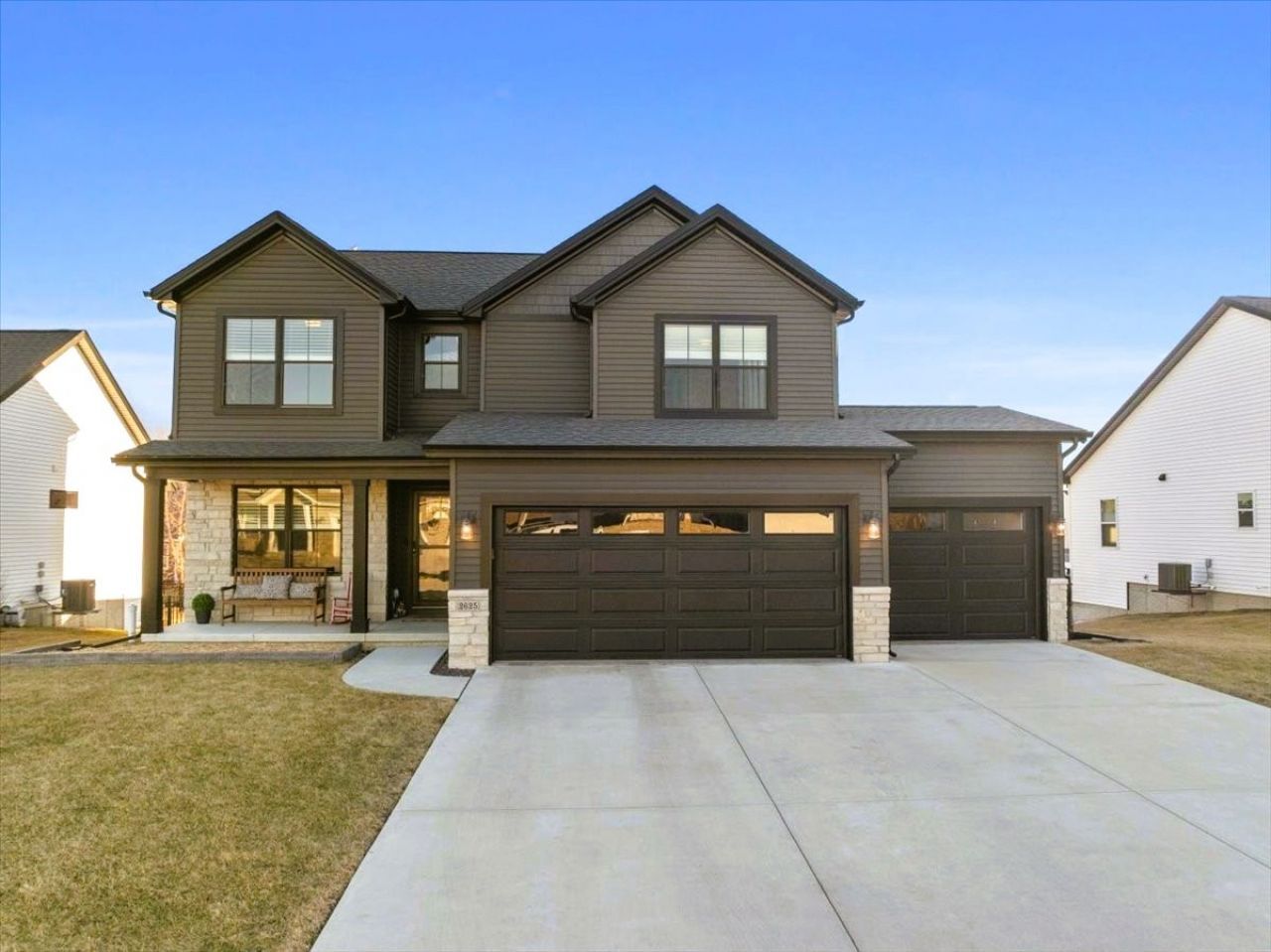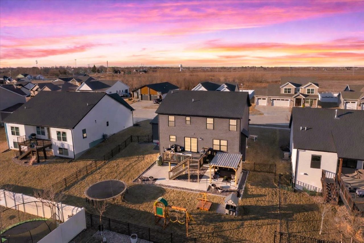 This quietly striking better than new beauty in Blackstone Trails offers impressive upgrades inside and out! Quality 2022 Franke build offers upgraded modern flair fixtures, rich paint selections, custom wood moldings and trim plus tasteful design touches throughout. Three modern and bright finished levels of living include 5 spacious bedrooms, 3.5 baths, 3-Car Garage plus a finished lower level with daylight windows offering airy flow for entertaining, storage and sleep space. Dramatic deep charcoal siding and windows contrast the weathered stone as you pass through the expansive covered front porch and into the inviting foyer, where you'll be greeted by the soft glow of an edison bulb pendant softly illuminating the metallic gold ceiling and custom moldings. Pass through the frosted french doors into the main level office space which has just received a fresh coat of cozy caramel paint, a serene space for ultimate privacy and productivity! Follow the blonde engineered hardwoods into the open concept family room with custom built-ins, cans, and cozy gas fireplace with subway tile surround. A wall of south-facing windows washes the space in natural light and invites you to linger longer in the eat-in kitchen or pass through the glass slider beckoning you to enjoy the raised deck for easy entertaining. Warm and inviting kitchen features pearl white cabinets with crown, quartz counters, subway tile backsplash and sharp stainless appliance suite including side-by-side refrigerator, undermount sink, dishwasher and low-profile gas range with range hood. Island offers additional seating and prep space plus nearby devoted pantry and drop-zone for added convenience. The open split staircase invites you to explore the light and bright second story offering vaulted primary suite with walk-in closet and private ensuite featuring dramatic hex tile, double sink vanity and oversized walk-in shower. Three additional bedrooms offer spacious closets with built-in shelving and another impressive full bathroom featuring another double sink vanity and separate tub/shower combo just great for guests. Convenient upper level laundry room features striking moroccan style tile and tons of storage potential. The perfect position of this home on a sloped lot affords the lowest level an airy main level feel with full-sized daylight windows flooding the second family room with natural light. Nearby full bathroom and 5th bedroom with impressive closet space offers privacy and comfort for extended stay guests and in-laws to enjoy. Well-planned exterior improvements include extensive landscaping and rock surrounding the home, plus fully fenced lot and impressive multi-level entertaining space including raised deck and poured lower patio with covered pergola for year-round enjoyment, just the right fit for a hot tub (does not stay) or fire pit! Utility room houses the HVAC system, radon mitigation system, sump pump, gas water heater and impressive Express Whole-Home Water Filtr